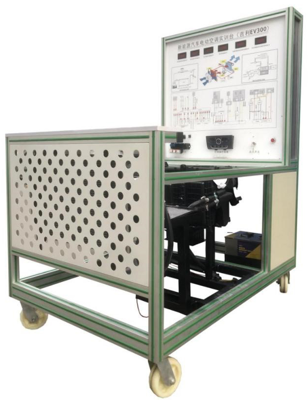 點(diǎn)火開關(guān)、電動(dòng)汽車空調(diào)壓縮機(jī)、膨脹閥總成、干燥器總成、鼓風(fēng)機(jī)總成、冷凝器、冷卻電子風(fēng)扇、電動(dòng)空調(diào)壓縮機(jī)控制器總成、空調(diào)蒸發(fā)箱總成、充電器與充電接口、充電插線、DC-DC轉(zhuǎn)換器、鋰電池組、空調(diào)操作面板、高低壓空調(diào)壓力表、采暖模塊總成、電源總開關(guān)、急停開關(guān)、直流接觸器、輔助蓄電池(12V45AH)、一體化全鋁合金型材搭建的移動(dòng)臺(tái)架(1500×1000×1700mm ,帶自鎖腳輪裝置,帶安裝檢測(cè)端子的原理面板948×898mm)、故障模擬與排除裝置、設(shè)備操作說(shuō)明書。