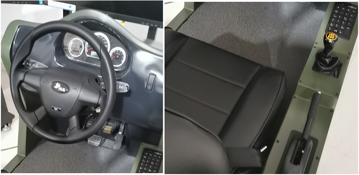 2)開放式艙體,方向盤、變速機構(gòu)、手制動、加油踏板、制動踏板、離合器踏板等實裝主要操作部件均需要模擬,其外觀尺寸、部署相對位置、操作行程,以及操作力度感受與實際基本一致,操縱機件性能工作可靠、操作靈活、低噪音。